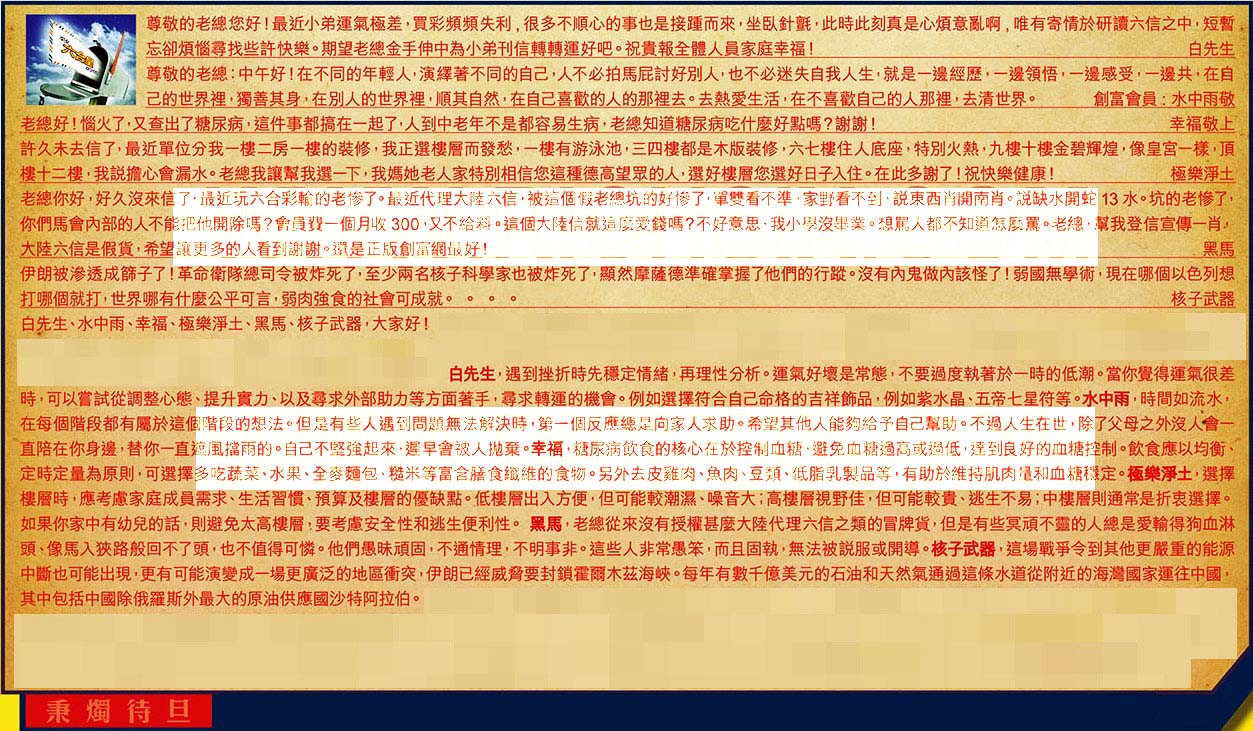 【1】.尊敬的老總您好!最近小弟運氣極差,買彩頻頻失利,很多不順心的事也是接踵而來,坐臥針氈,此時此刻真是心煩意亂啊,唯有寄情於研讀六信之中,短暫忘卻煩惱尋找些許快樂。期望老總金手伸中為小弟刊信轉轉運好吧。祝貴報全體人員家庭幸福! 白先生