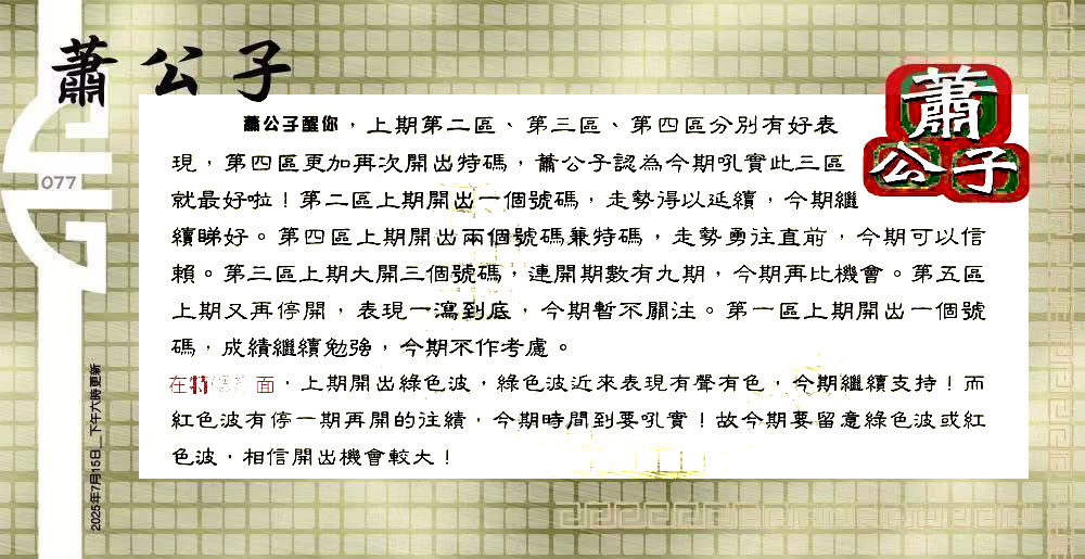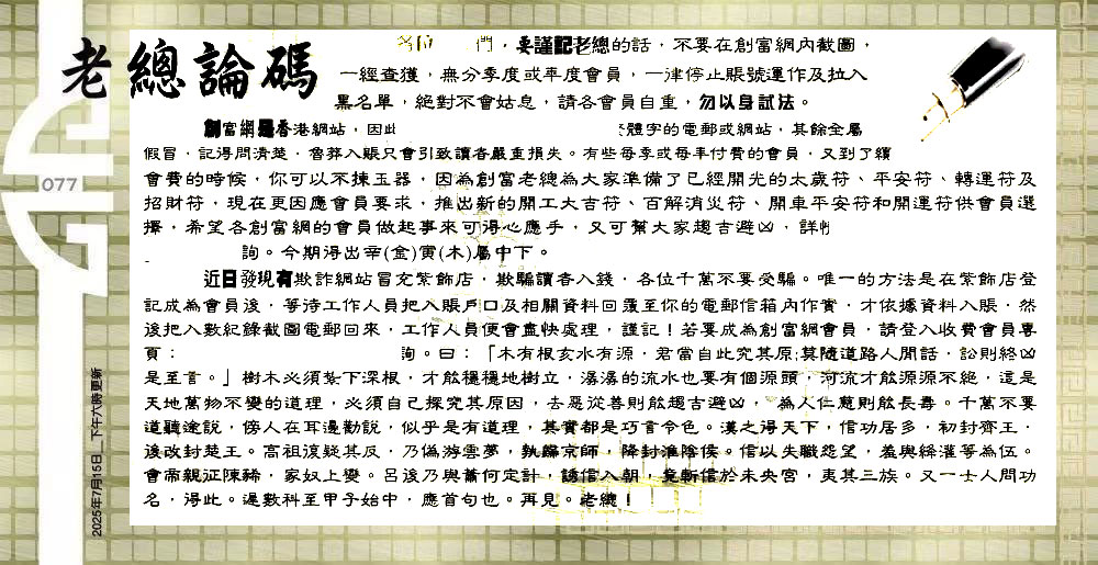 077期:六合皇金句/老总论码/萧公子/林大师/五行夺码/老总信箱截