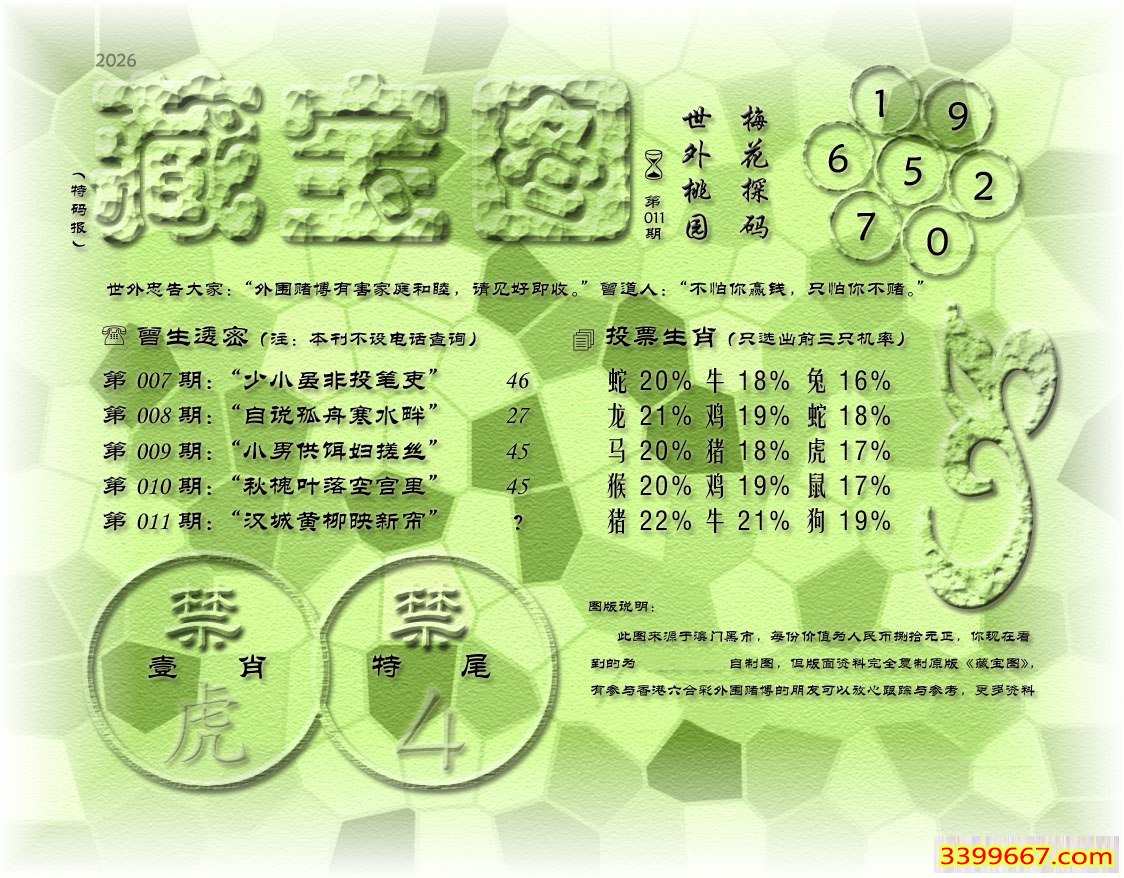 011期藏寶圖 新:因想后湖题柱处 老:汉城黄柳映新帘 禁:虎 禁:4尾