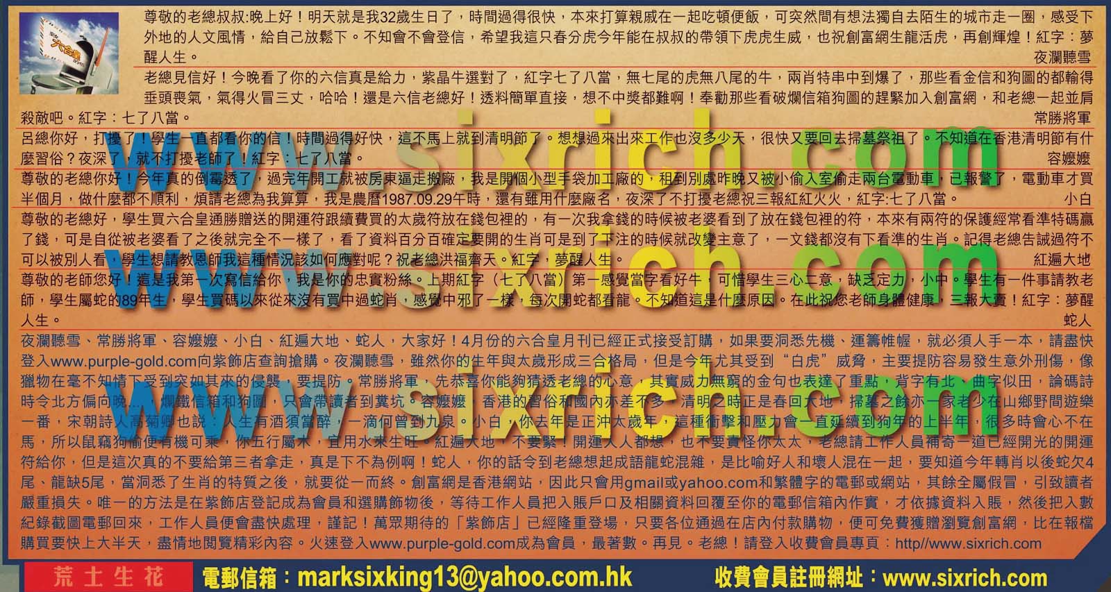 【2】老總見信好!今晚看了你的六信真是給力,紫晶牛選對了 |紅字七了八當,無七尾的虎無八尾的牛,兩肖特串中到爆了,那些看金信和狗圖的都輸得垂頭喪氣,氣得火冒三丈,哈哈!還是六信老總好!透料簡單直接,想不中獎都難啊!奉勸那些看破爛信箱狗圖的趕緊加入創富網,和老總一起並肩殺敵吧。紅字:七了八當。   ---常勝將軍
