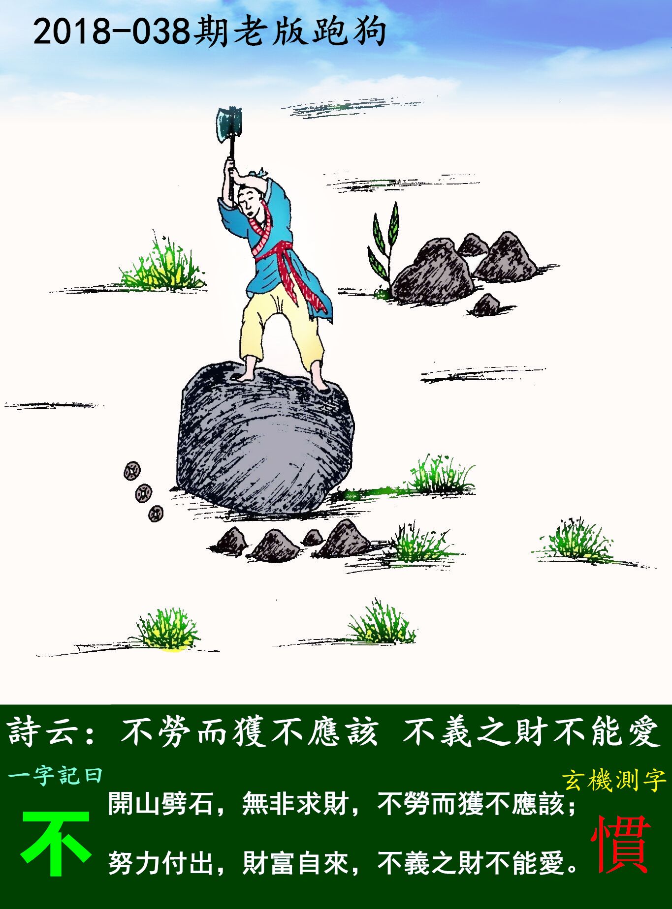 分析:開山劈石,無非求財,不勞而獲不應該;所谓鸟为食亡,人为财死。君子爱财取之有道。努力付出,財富自來,不義之財不能愛。靠自己勤劳的双手,努力付出,财富自然来。图中男子开山劈石是为了钱财,但是他靠的是他自己辛勤劳作、付出。所以他所得得钱财是赢得的。