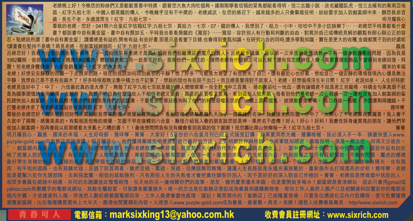 【1】老總晚上好!今晚您的粉絲們又是歡歡喜喜中特獎,跟著您大魚大肉吃個夠。連剛剛學看信箱的菜鳥都能看得明,信二古龍小說,改名藏龍臥虎,信三去暖和的東南亞地區,紅字九祖七宗,中國人都是龍的傳人,今晚幾乎沒有不中獎的,老總威武,在您的感召下,越來越多的人只會棄暗投明,紛紛要求加入到創富網中來,願您長命百歲,長生不老,永遠渡眾生!紅字: 九祖七宗。     ---明月耀我心