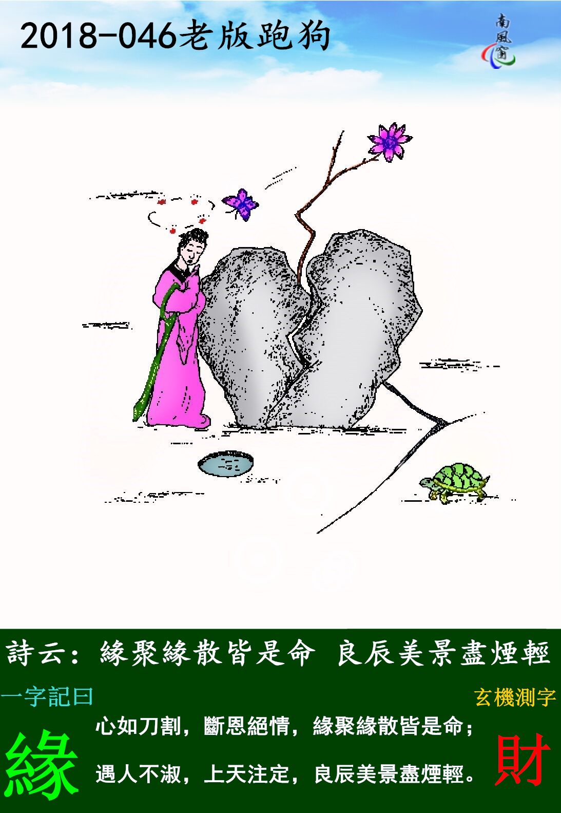 046期:老版跑狗一字記之曰:【緣】玄機測字《財》