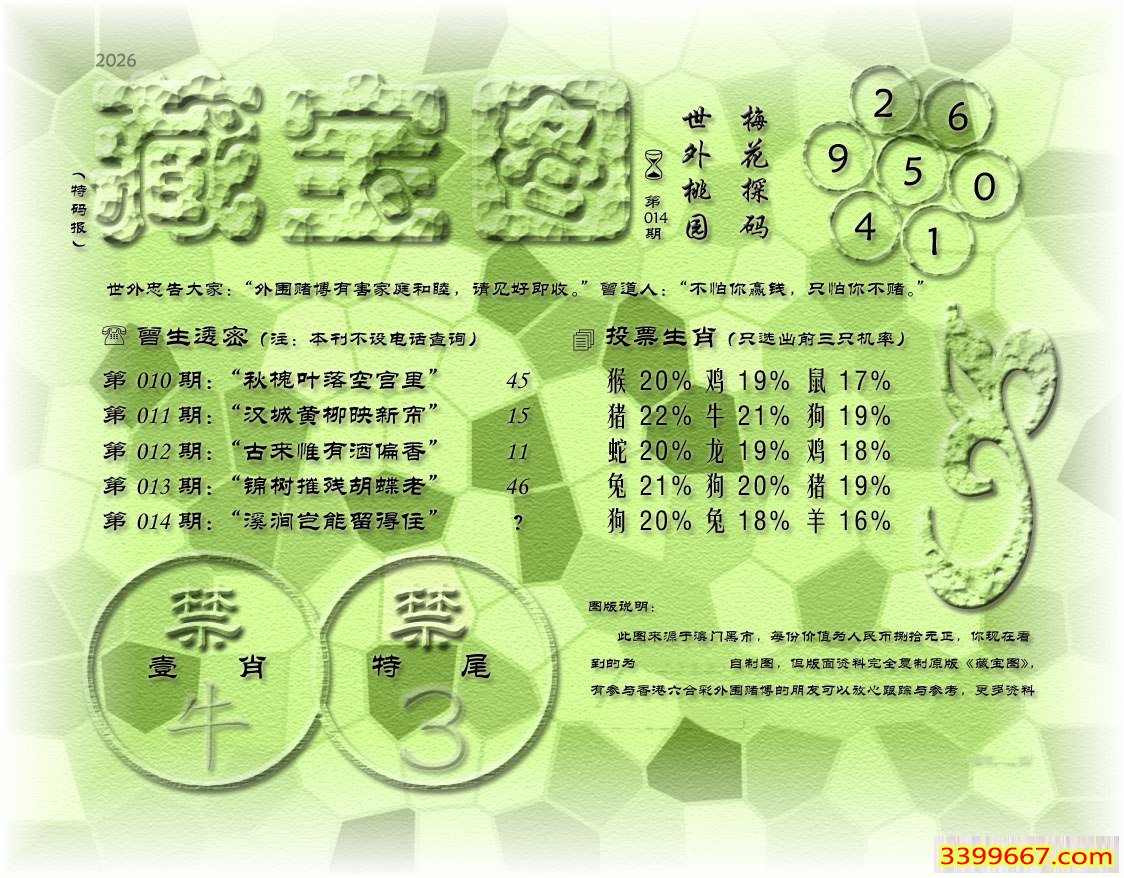 014期藏寶圖 新:但觉山光侵酒绿 老:溪涧岂能留得住 禁:牛 禁:3尾